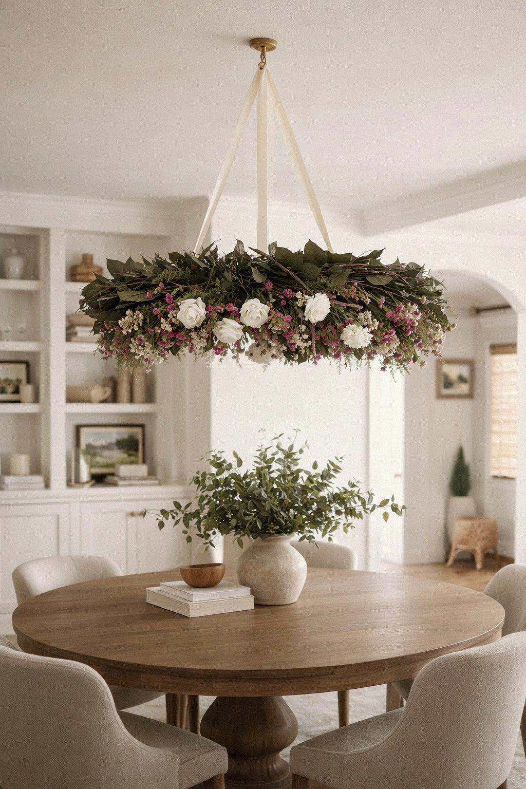 To suspend your wreath from the ceiling like a chandelier, we recommend using sturdy, decorative ribbon—such as ivory satin—for a romantic and polished look. Cut three or four equal-length pieces and securely attach them at evenly spaced points around the wreath’s frame, ensuring all attachments are balanced to keep the wreath level. Gather the ribbons at the top and tie them together in a knot or loop, then hang the bundle from a strong ceiling hook or ceiling-mounted plant hanger that’s rated to support the wreath’s weight. Make sure the hook is anchored securely into a ceiling stud for stability. This beautiful floating display is perfect for weddings, receptions, or styled home decor over a round table or entryway.