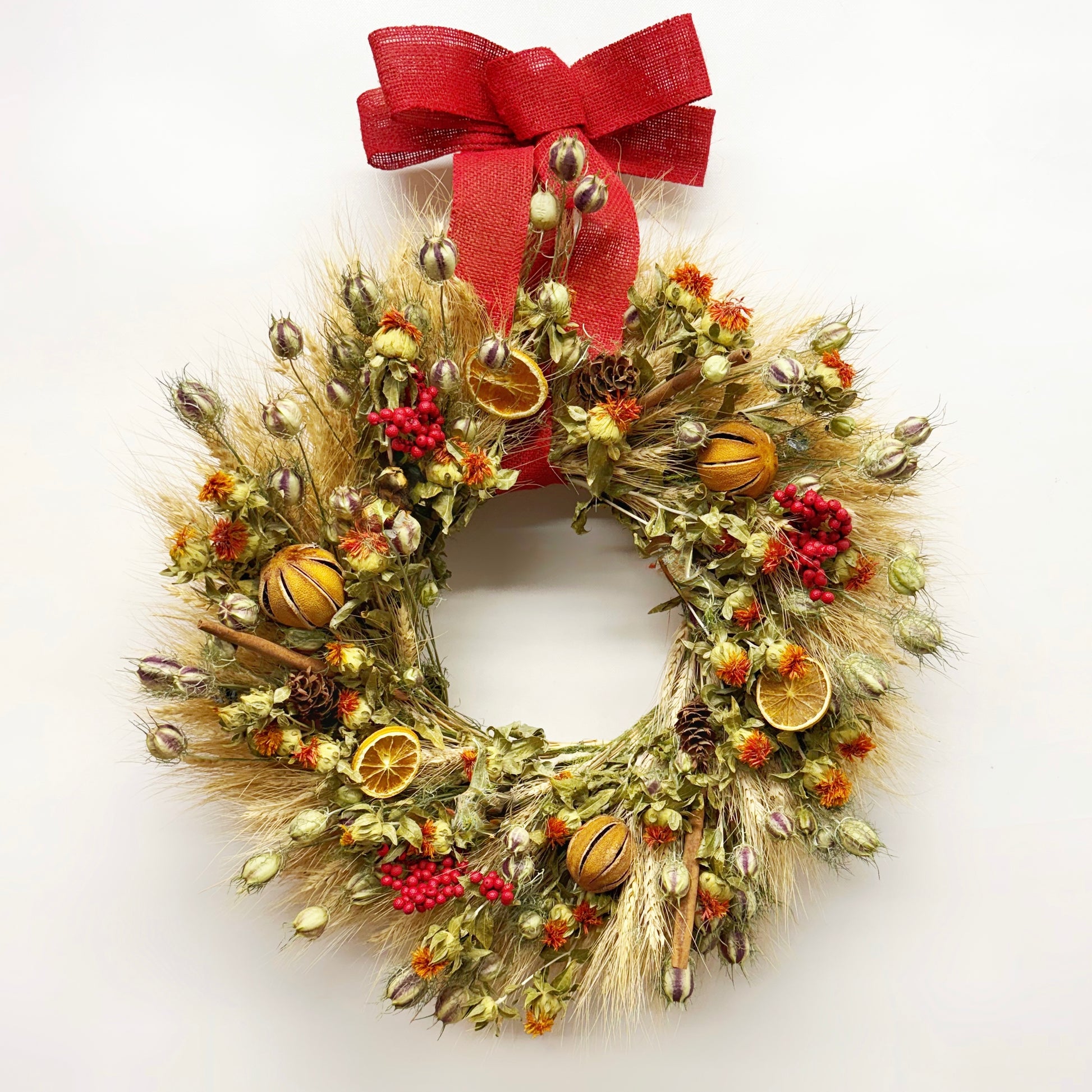 A symphony of natural elegance, this handcrafted wreath blends the warmth of nature with timeless holiday charm. Golden blond wheat and textured nigella pods form a lush backdrop, while fiery safflower and clusters of red canella berries add vibrant pops of color. Fragrant cinnamon sticks nestle among whole citrus and sunlit orange slices, infusing the design with cozy, spiced appeal. Finished with a bold red bow, this wreath brings together the richness of the harvest and the spirit of the season—perfect for welcoming guests with warmth and cheer.