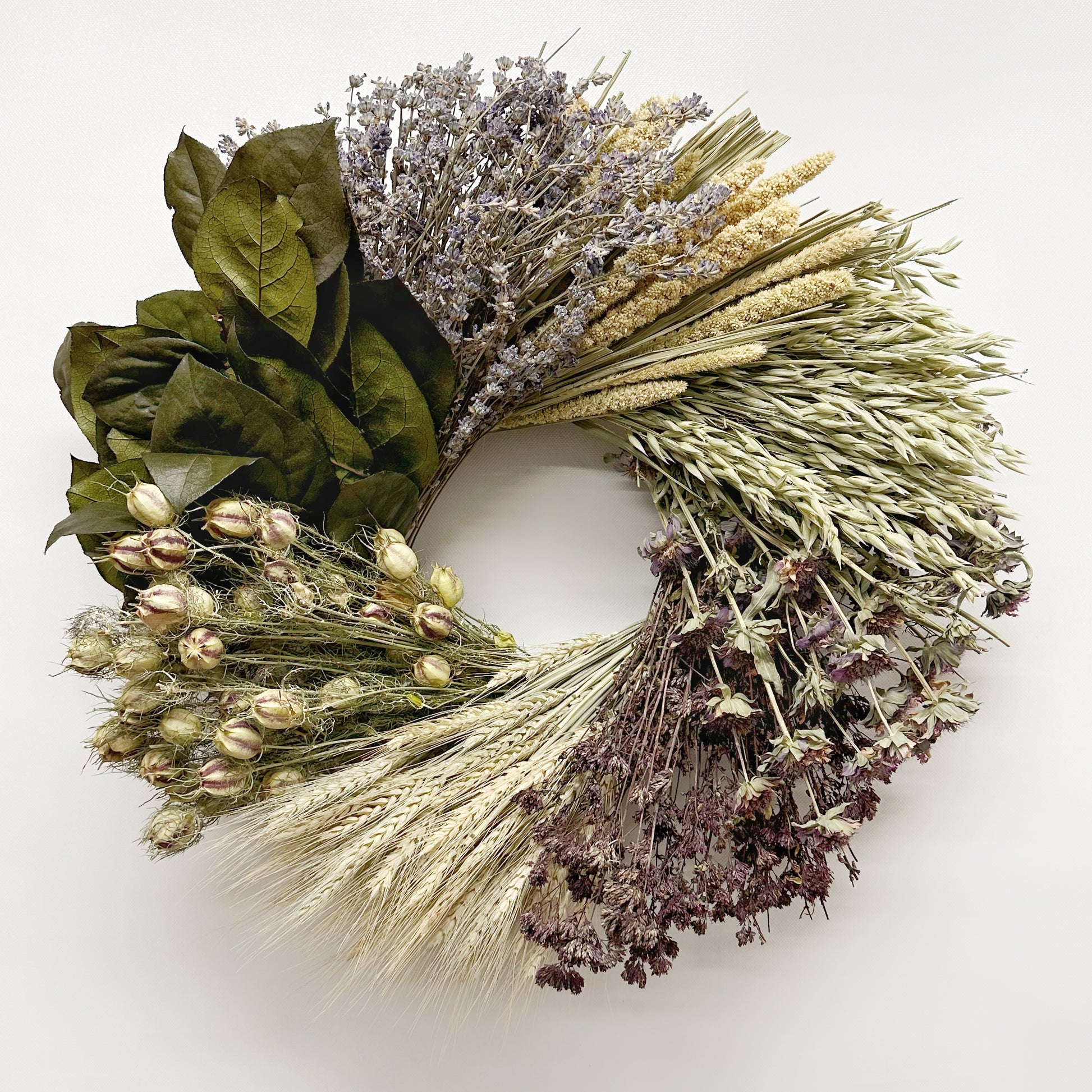 Beloved in name and in nature, the Amaris Wreath gathers the poetry of the meadow into a timeless circle. Hand-woven with lush salal leaves, airy oats, lavender sprigs, sculptural nigella pods, and earthy grains, it whispers of wild fields at golden hour. Soft purples, muted greens, and gentle ivory tones create a palette both grounding and ethereal — a piece meant to bring quiet beauty indoors, season after season.