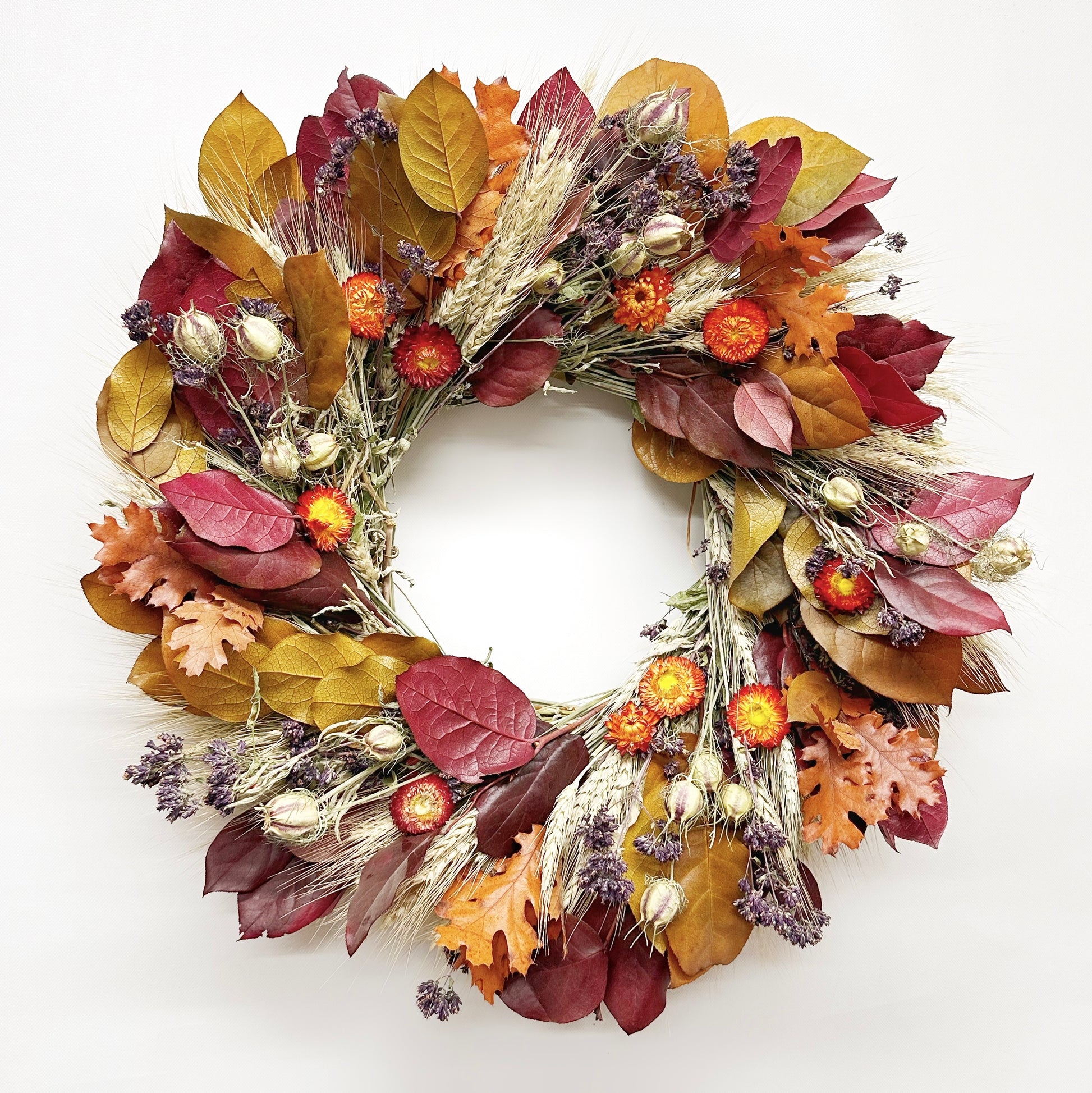 Bring the warmth of autumn into your home with this richly textured Autumn Afterglow Wreath. Handcrafted from air-dried green wheat and fragrant oregano, it is adorned with delicate nigella pods, vibrant orange strawflowers, and layers of preserved oak and salal leaves in deep burgundy and golden hues. The mix of natural grains, rustic botanicals, and glowing fall colors captures the essence of a crisp harvest season, making it a timeless accent for your front door, dining room, or mantel.
