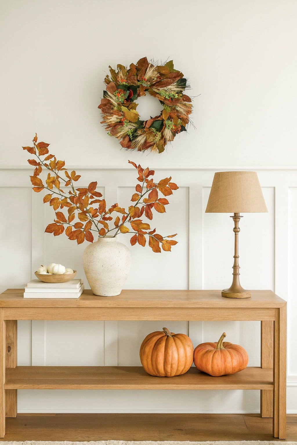 Celebrate the golden hues of the season with our Autumn Drift wreath — a warm and textured blend of quail brush twigs, preserved green and yellow salal leaves, blond wheat, flax linum, and fiery orange safflower. Accented with rich orange oak leaves, this wreath captures the essence of autumn’s natural beauty. Perfect for bringing cozy, earthy charm to your home decor.