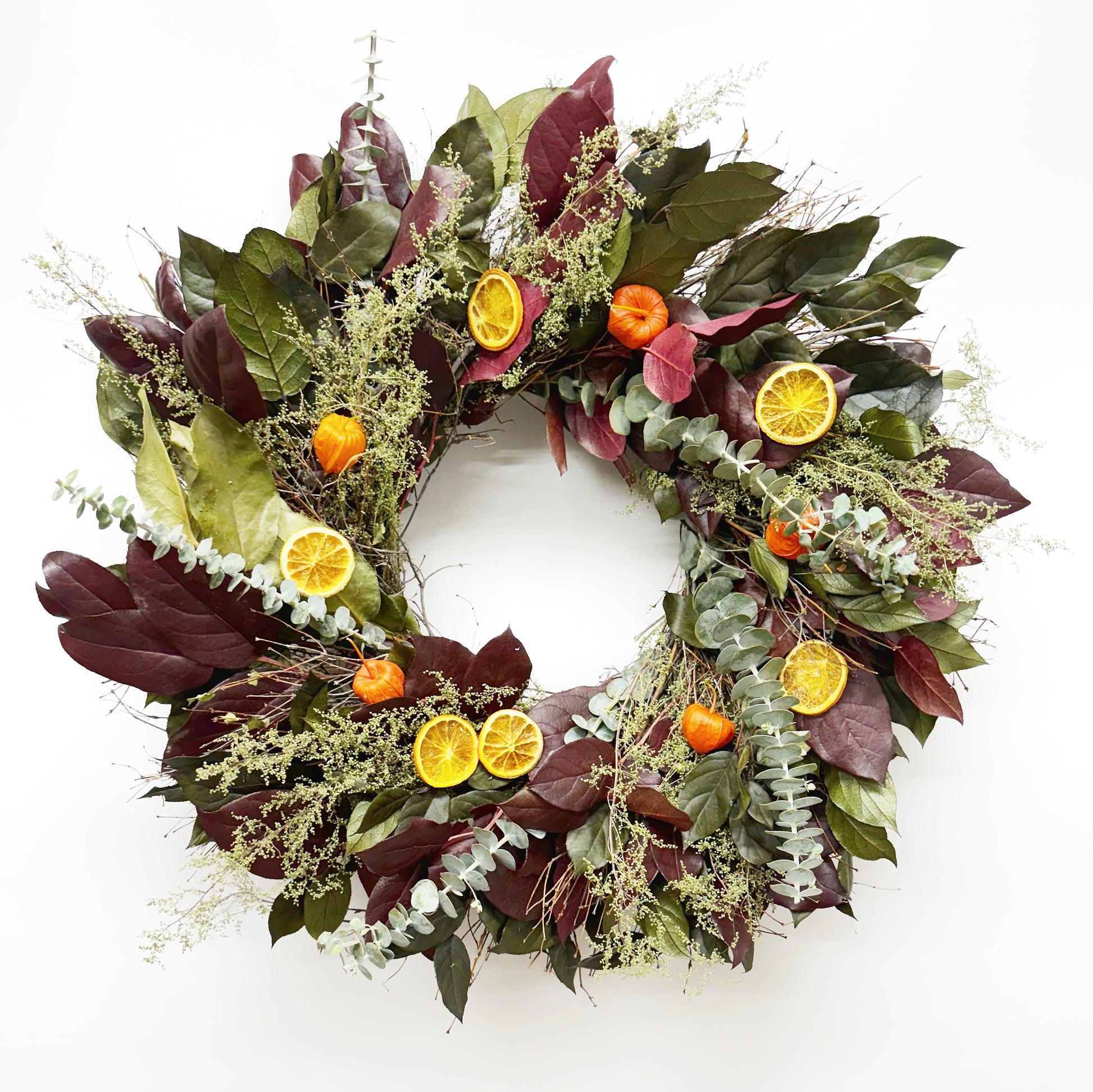 A richly textured autumn wreath crafted with layered preserved burgundy and green leaves, dried orange slices, twigs, sweet annie, eucalyptus, and orange lanterns —bringing a cozy, natural charm to any space.
