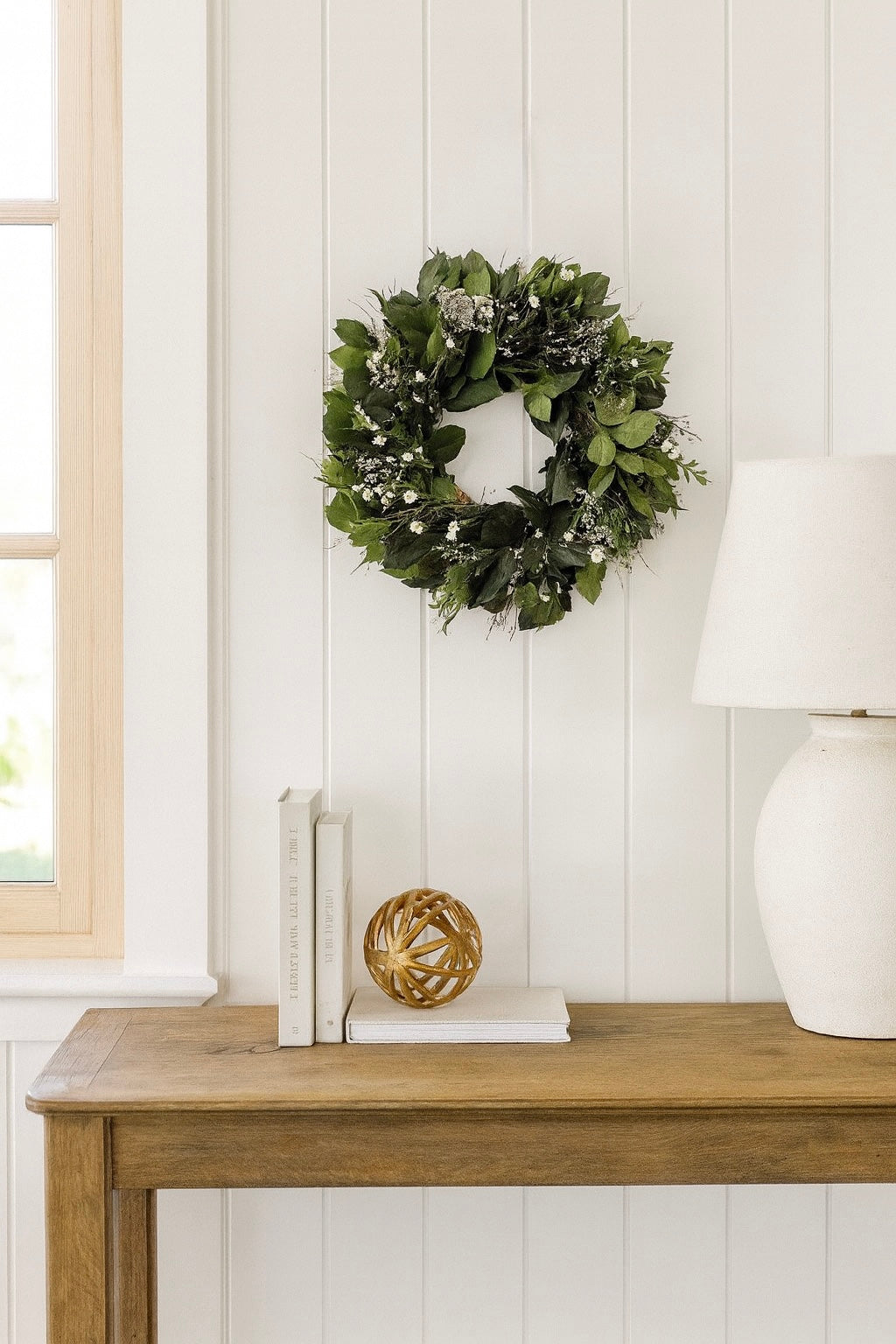 A beautiful textured year-round wreath crafted with layered preserved green leaves, air dried twigs, boxwood, ammobium daisies, and german statice—bringing a cozy, natural charm to any space.