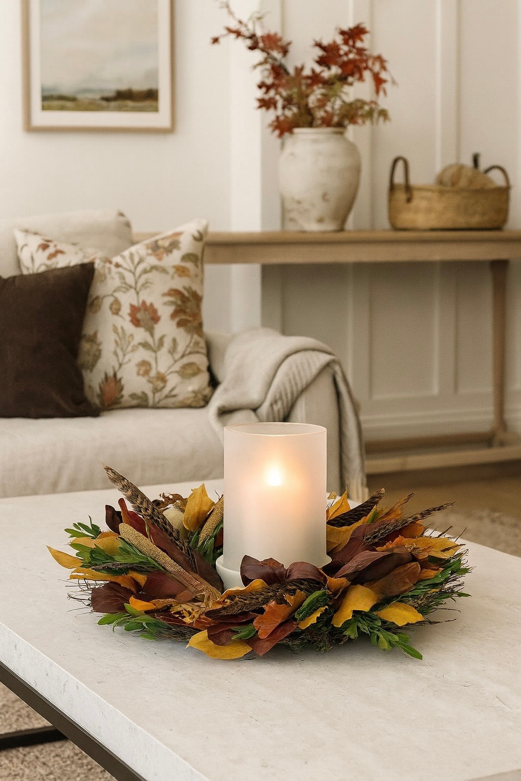 A handcrafted wreath that evokes the soft rustle of autumn leaves, the quiet beauty of pheasant feathers, and the earthy elegance of the natural grains and foliage in the wreath. Composed of preserved burgundy and yellow salal leaves, fall oak leaves, dried cedar, flax linum, boxwood, millet, and pheasant feathers.