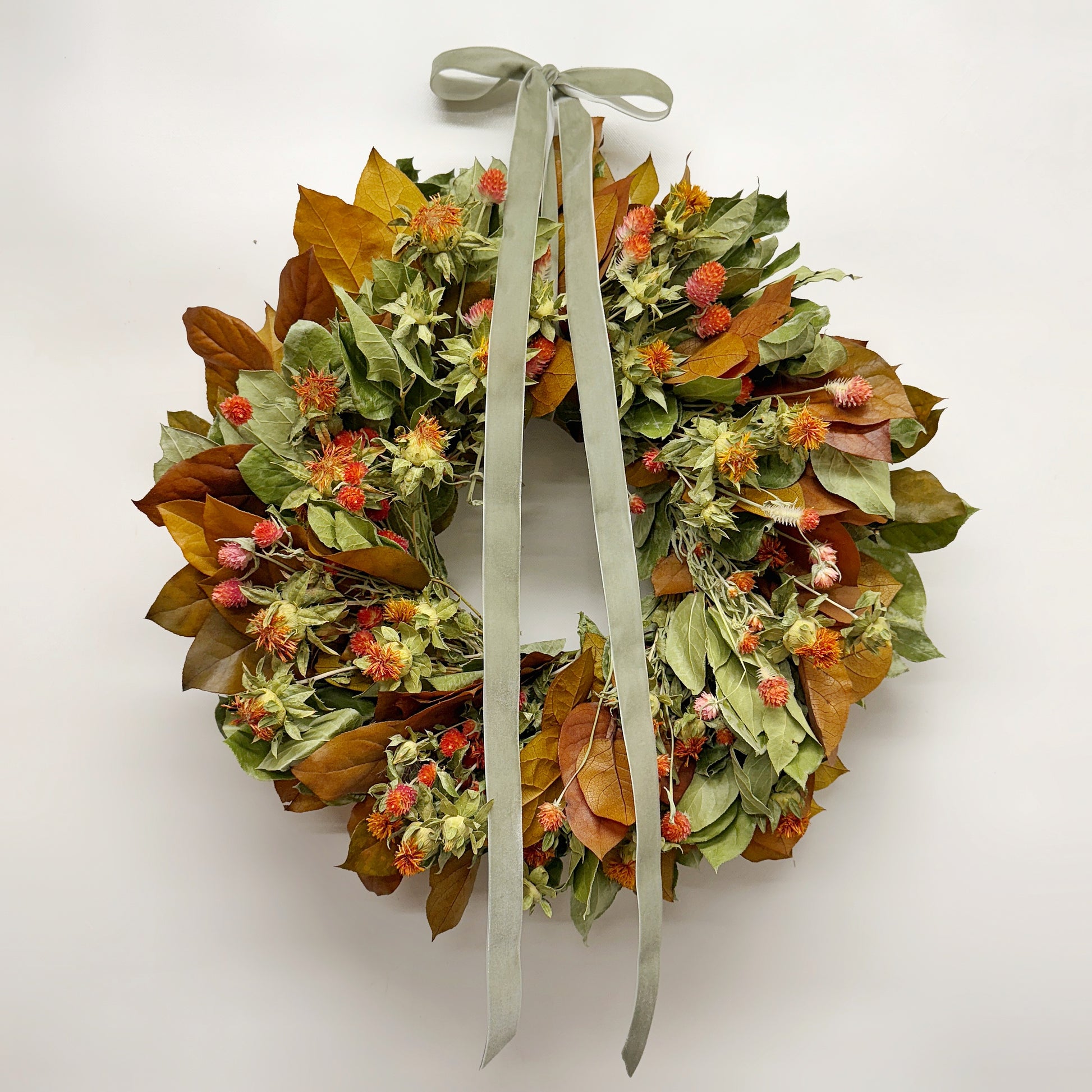 Touches of safflower and globe amaranth offer flickers of coral and bright ember tones—small bursts of color that feel organic, playful, and refined. Finished with a long velvet sage bow, this wreath has a soft romantic presence that feels both seasonal and timeless.