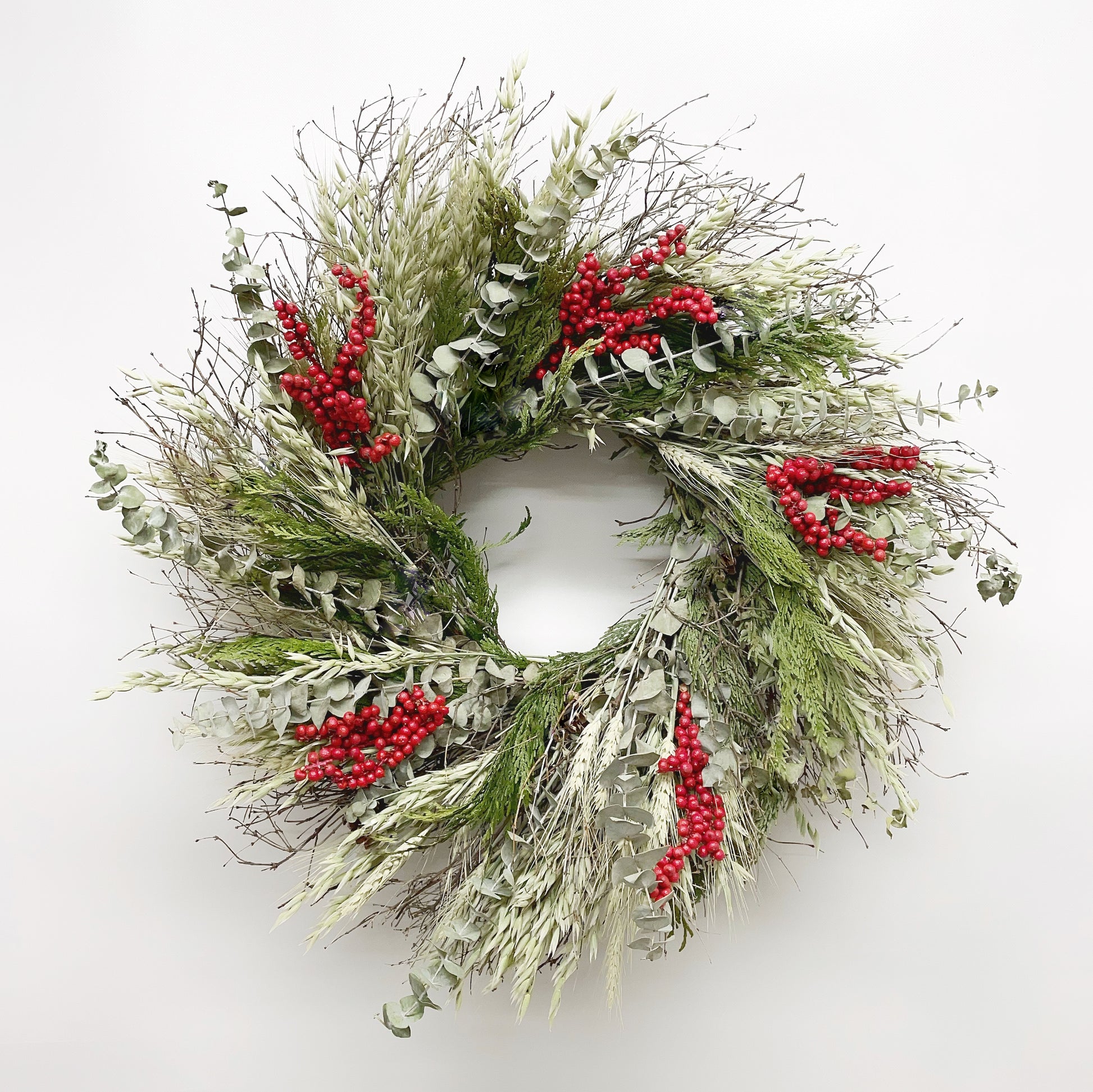 A natural celebration of winter’s beauty, this handcrafted wreath blends air-dried avena and rustic twigs with the soft silvery tones of baby eucalyptus and the deep green fragrance of cedar. Accented by clusters of vibrant red canella berries, it strikes the perfect balance of earthy texture and festive brightness. Elegant yet organic, this wreath brings the warmth of the season indoors, offering timeless charm for your home.