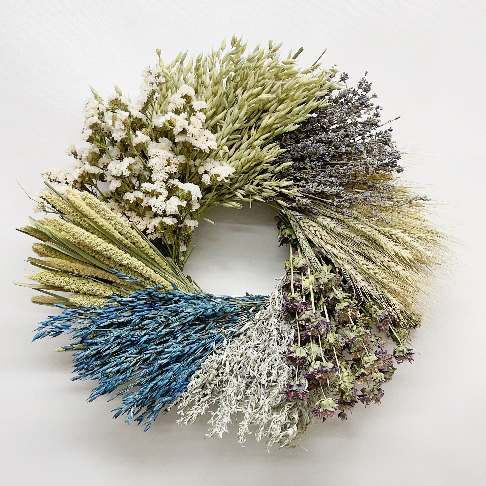 Brimming with natural beauty, this wreath weaves together blue-painted avena oats, millet, and natural green oats with delicate white sinuata and fragrant lavender. Stems of green wheat and lemon mint add meadow charm, while silvery artemisia lends an airy, timeless elegance. A harmonious blend of color and texture, it brings the serene spirit of the countryside into your home.