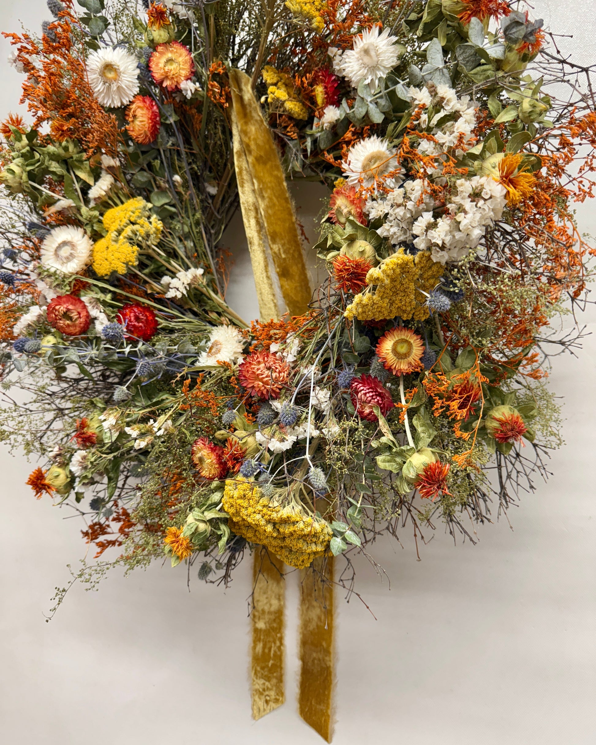 Finished with a frayed-edge ribbon, this piece feels both timeless and effortlessly artful — a curated slice of meadow beauty designed to last season after season.
