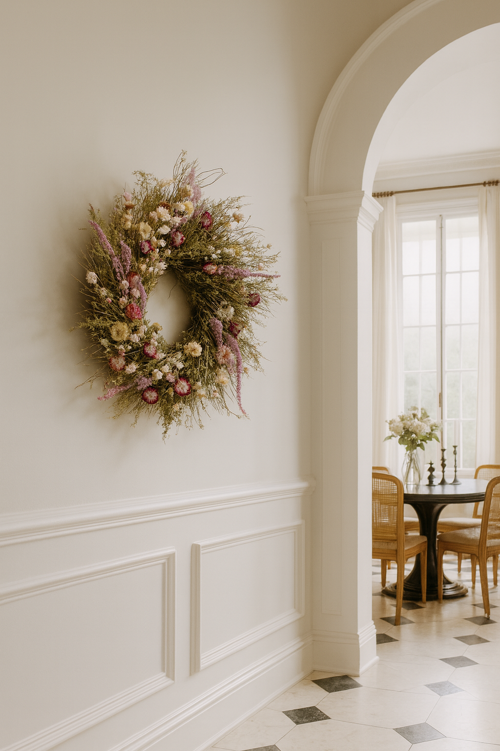 A wild-gathered halo of everlasting blooms, this wreath is woven with quail brush twigs and filled with garden treasures—globe amaranth, rattail statice, sweet annie, ammobium daisies, and strawflowers. In shades of blush, ivory, and berry, each stem is air-dried to preserve its soft texture and timeless beauty. Hand-crafted on our Washington farm, it brings a touch of poetic countryside charm to your home—season after season.