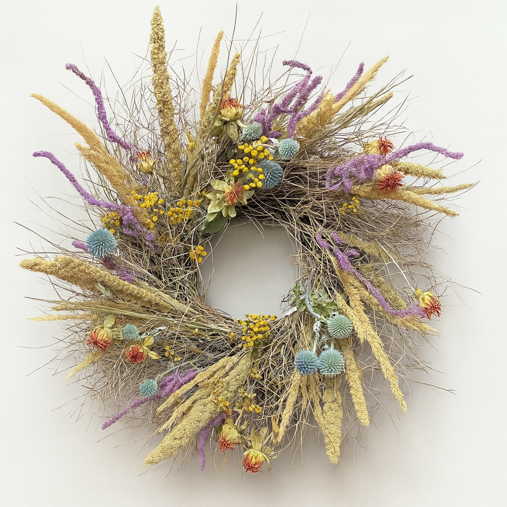 Handcrafted with air-dried twigs and wisps of tumbleweed, the Cloverfell Wreath captures the untamed beauty of the open countryside. Soft plumes of Saltese feather reed grass and golden millet sweep outward in airy motion, while pops of vibrant safflower and delicate rattail statice add a touch of warmth and whimsy. Clusters of echinops bring cool, silvery contrast, balanced by sunny sprigs of yellow tansy tucked throughout.