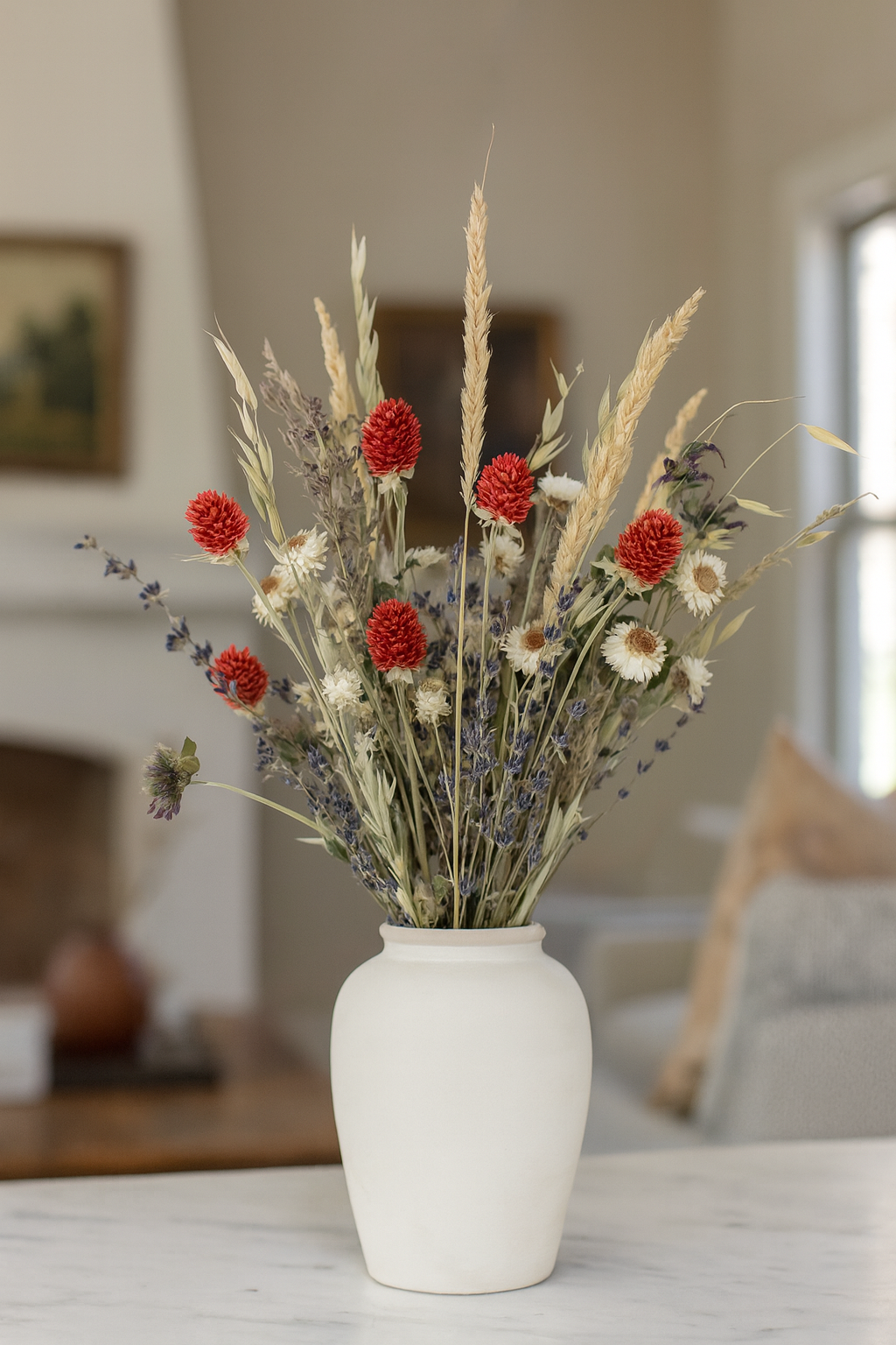 A spirited celebration of color and texture, this hand-gathered bouquet brings together nature’s warmth with timeless charm. Air-dried avena oats and Saltese feather reed grass lend soft golden movement, while sprigs of lavender and lemon mint weave in subtle fragrance and dusky tones. Crimson red globe amaranth adds a bold spark, contrasted by the delicate ivory petals of ammobium daisies. The result is a graceful, everlasting bouquet—both natural and refined—perfect for brightening an entryway, adorning a dining table, or gifting as a keepsake of natural beauty.