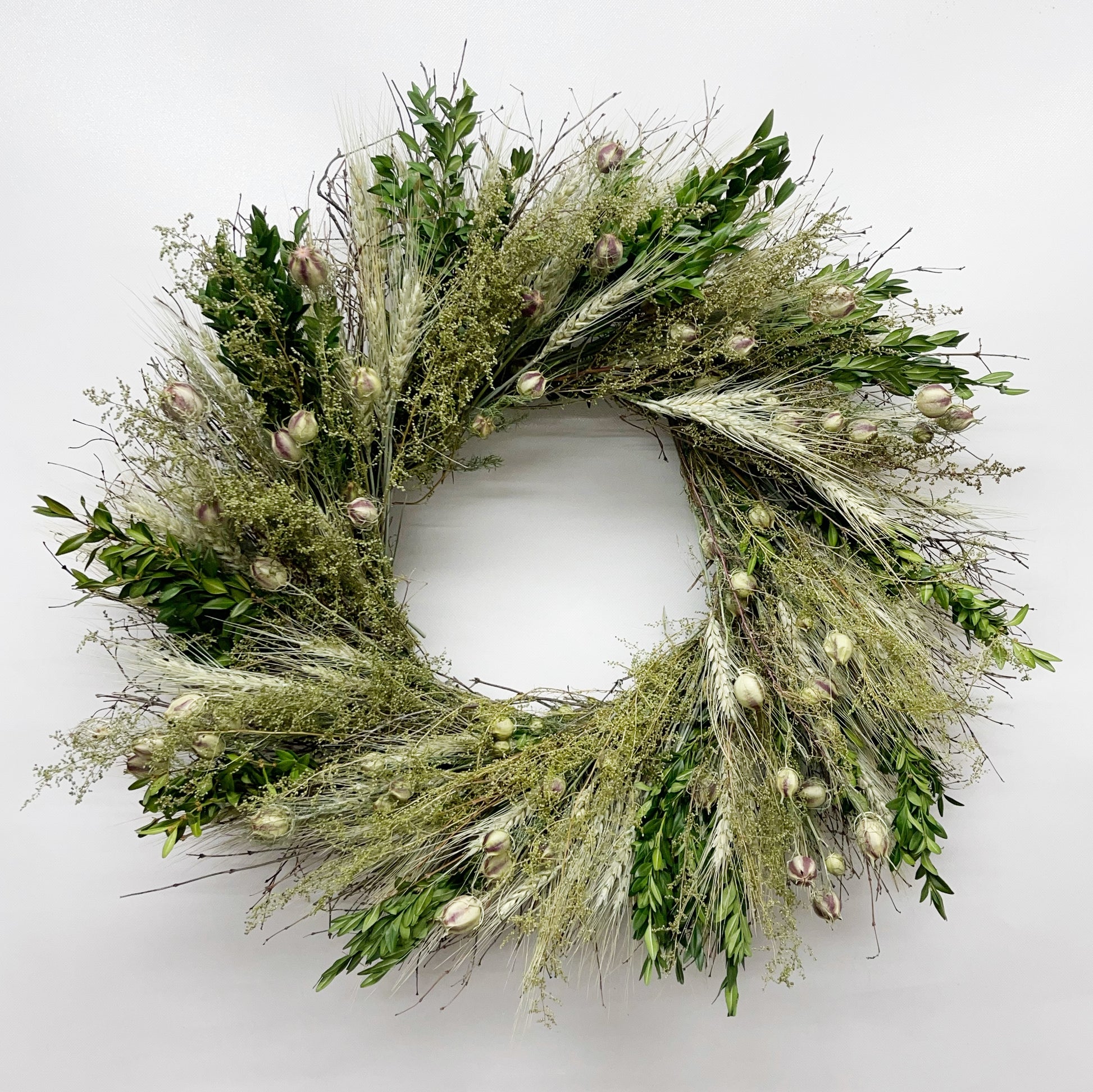 A celebration of natural elegance, this handcrafted wreath is woven from air-dried twigs, lush green wheat, sweet annie, and sprigs of boxwood. Wisps of delicate nigella add soft texture and offer a warm, natural welcome that feels both timeless and inviting.