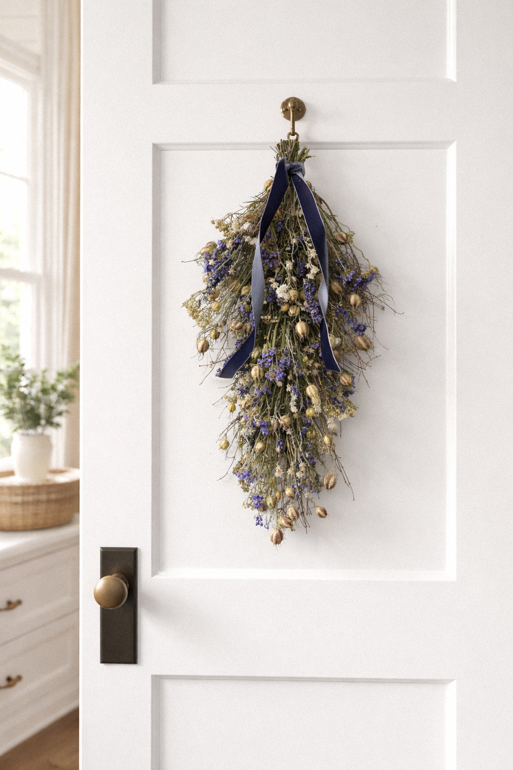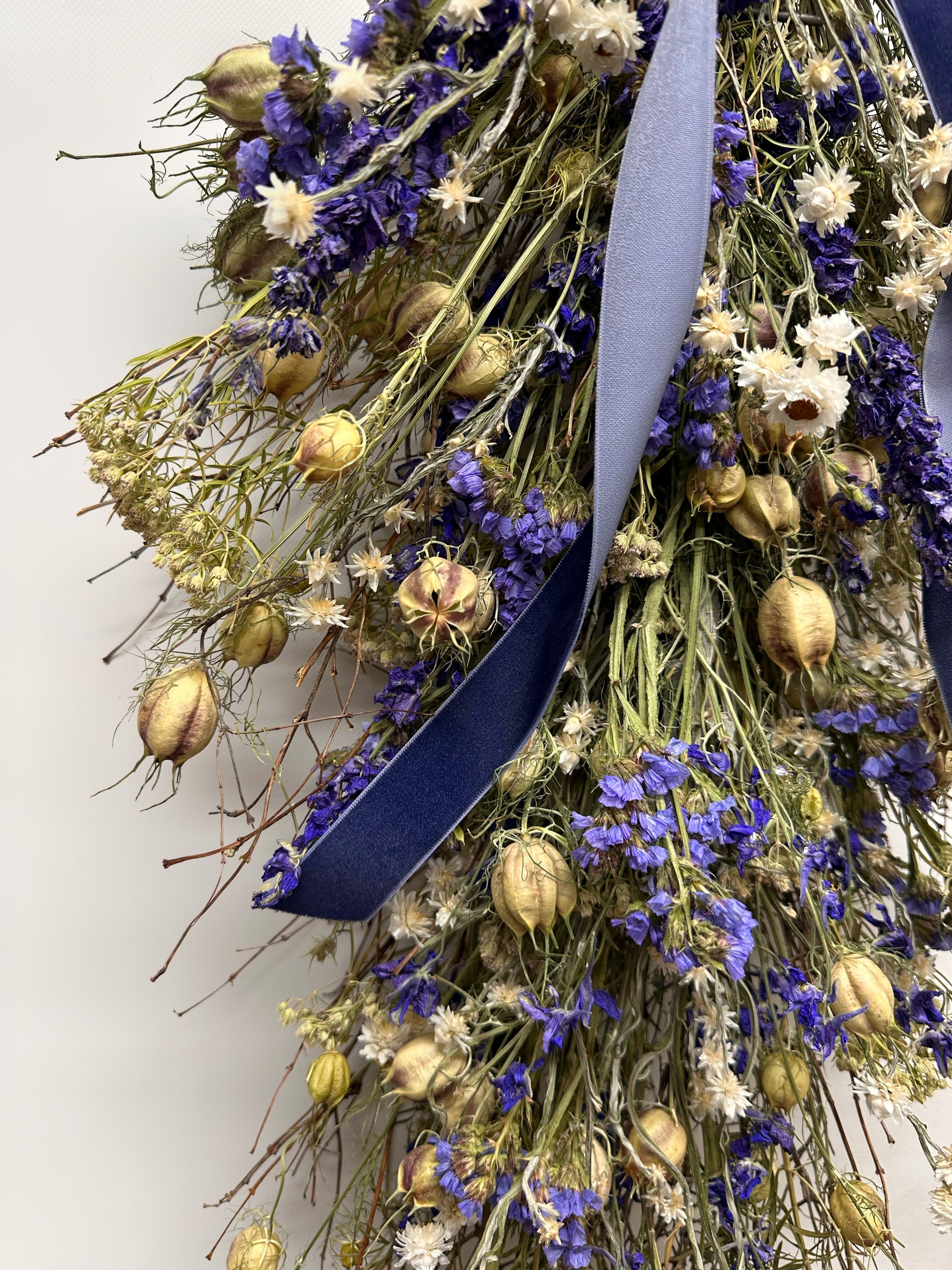 This hand-gathered swag brings together the timeless charm of field-grown botanicals. Air-dried twigs give it a natural, organic structure, while stems of blue larkspur and blue sinuata statice add graceful height and vibrant shades of indigo and violet. Soft sprigs of mountain mint and nigella weave a gentle texture and fragrance through the arrangement, perfectly balanced by the delicate white star-shaped blooms of ammobium. Together, the palette feels both airy and whimsical—capturing the essence of a wildflower meadow, preserved to last. Finished with a navy blue velvet bow.