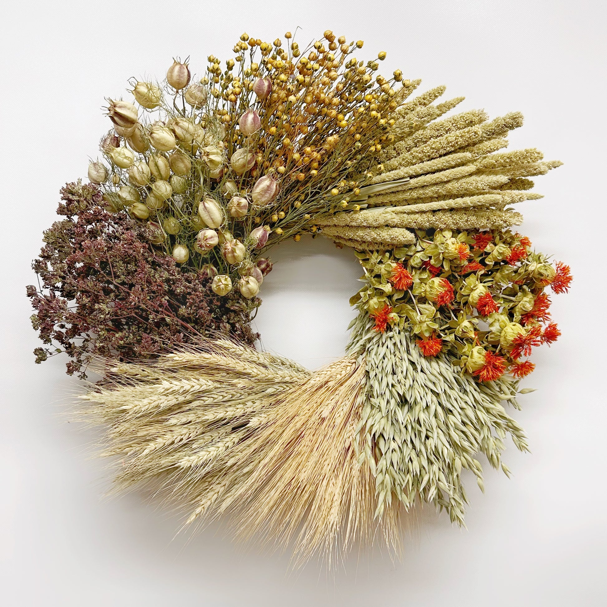 Golden fields meet quiet artistry in our Honeyvale Wreath — a handmade gathering of oregano, millet, nigella pods, flax, green wheat, blonde wheat, safflower, and avena oats. Each stem is grown and naturally air-dried on our Washington flower farm, then arranged to capture the mellow glow of harvest light. The soft grains and fiery safflower create a sun-washed palette — honey, amber, and rust — that feels both timeless and alive. A wreath that brings the warmth of late summer and the calm of the countryside into your home, season after season.