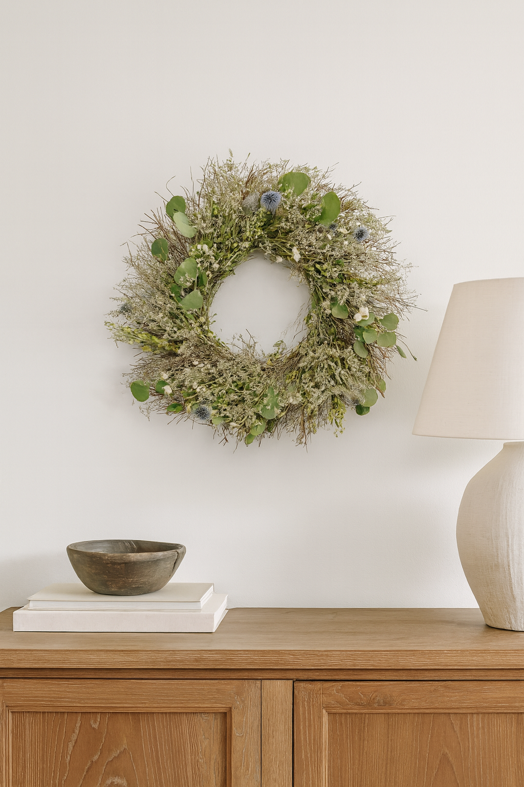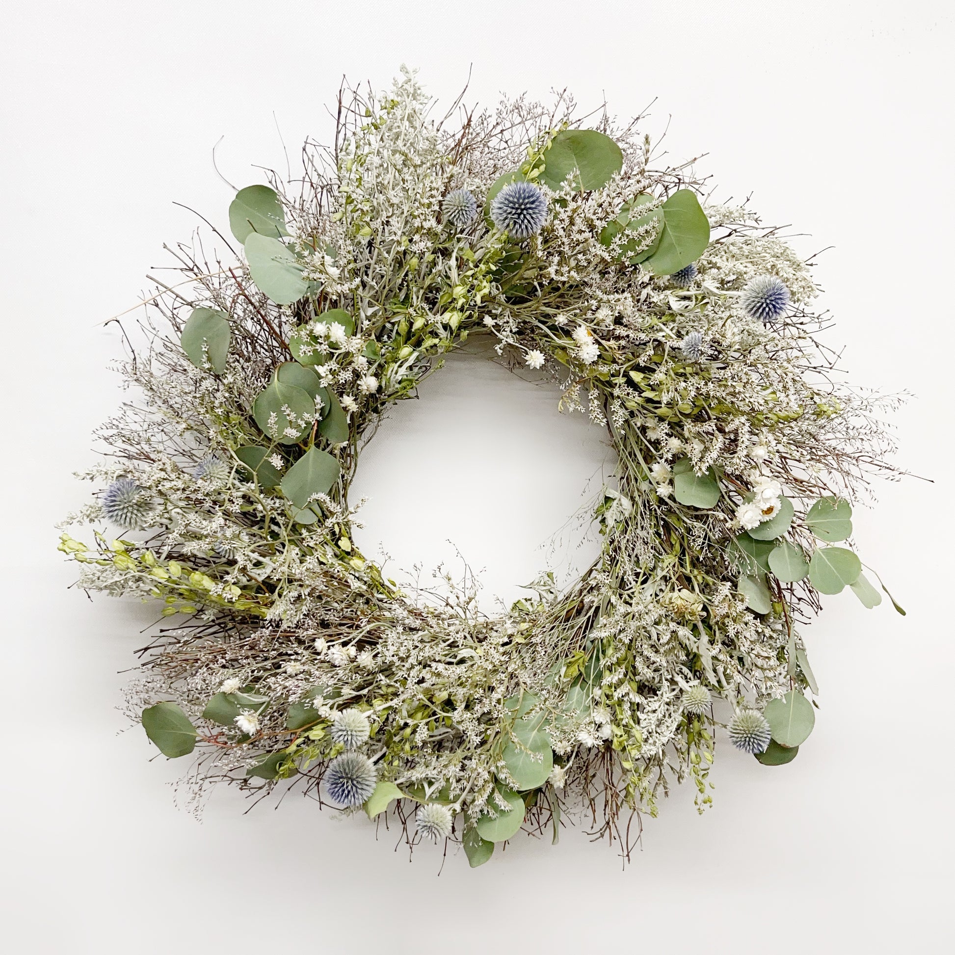 The Luna Frost Wreath is a delicate balance of organic texture and airy elegance. Handcrafted with a base of air-dried twigs, it is adorned with clusters of soft german statice, airy caspia, and the snowy touch of ammobium blooms. Sprigs of silver dollar eucalyptus add a refreshing green luster, while globe-like echinops thistles bring a striking pop of silvery blue. Finished with sprigs of lupidium field pennycress, this wreath feels both wild and refined—a timeless piece that captures the quiet beauty of windswept meadows and woodland paths. Perfect for year-round display, it adds a natural, graceful touch to any home.