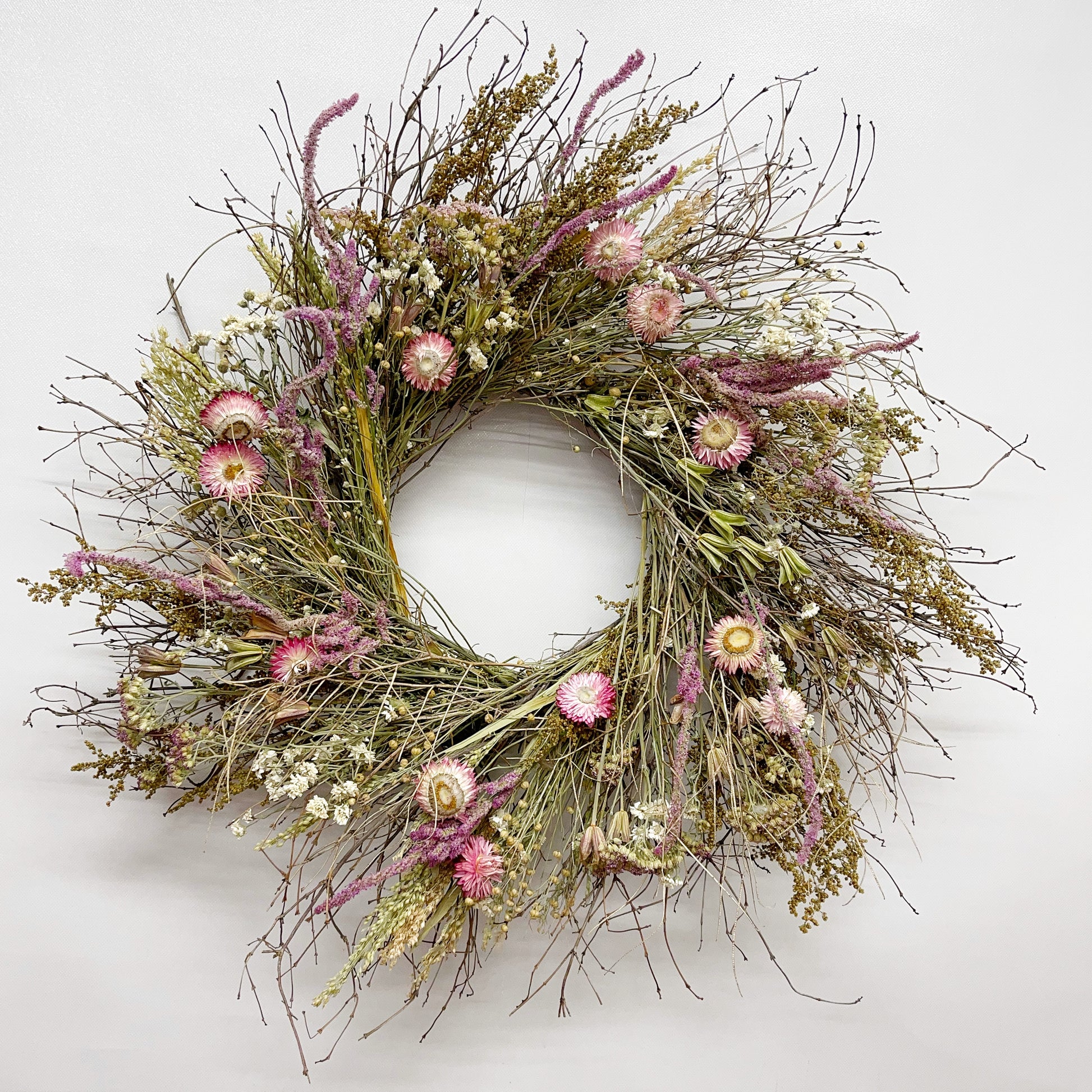 A wild crafted celebration of nature’s textures and hues, this handcrafted wreath is woven from airy, sun-cured twigs and sprigs of sweet annie. Clusters of rattail statice, orientalis, and muted shades of yarrow mingle with the soft shimmer of pearly everlasting and the gentle blush of pink strawflowers. Accents of prosso millet add earthy depth, creating a piece that feels both wild and timeless—perfect for bringing the quiet beauty of the meadow into your home.