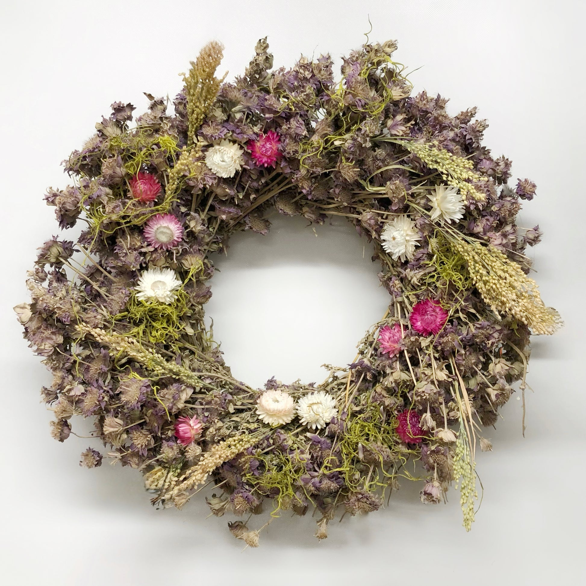 The Moss and Sprig Wreath is a delicate celebration of nature’s elegance. Air-dried lemon mint, proso millet, and soft moss form a textured, serene base, accented with gentle pink and white strawflowers for a subtle, sophisticated touch. Perfect for doors, walls, or as a statement décor piece, it brings understated beauty and timeless charm to any space.
