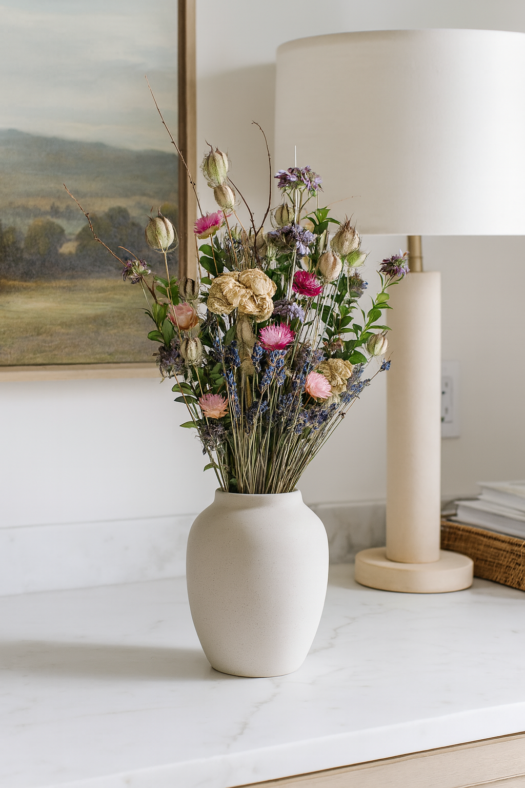 A timeless gathering of nature’s textures and hues, Petaline brings a soft yet lively elegance to any space. Handcrafted with slender dried twigs, lush boxwood greens, airy pods of nigella, and fragrant sprigs of lavender, this bouquet celebrates both structure and whimsy. Warm beige cockscomb celosia lends sculptural charm, while lemon mint adds subtle freshness. Accented with cheerful strawflowers in blush and berry tones, Petaline feels at once refined and playful—a botanical keepsake for everyday beauty and elevated décor.