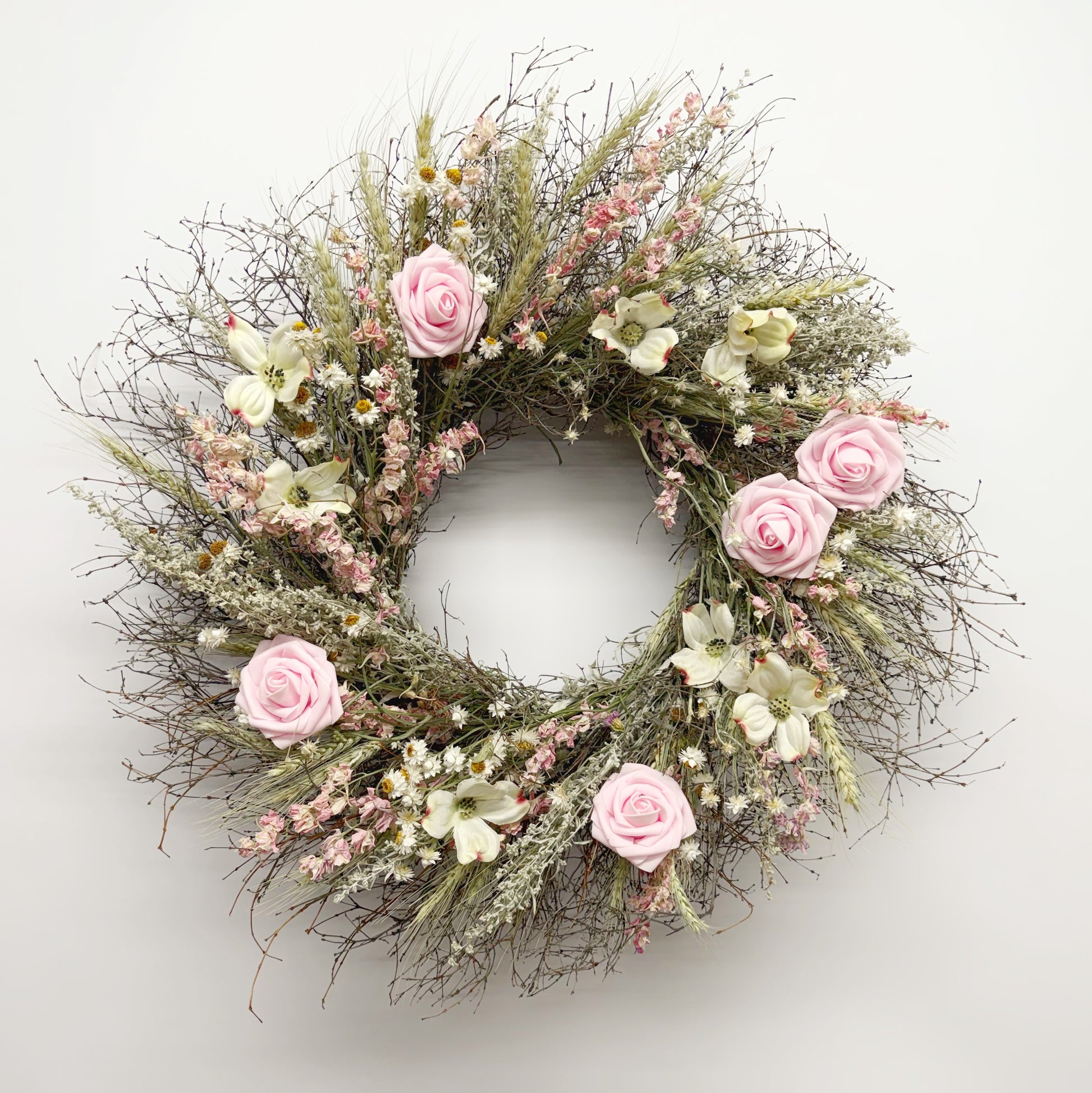 Blush pink larkspur weaves through silvery artemisia and clusters of cheerful ammobium daisies, while green wheat adds graceful height and a subtle meadow-inspired charm. Topping the arrangement are faux pink paper roses and silk dogwood blooms — thoughtfully placed for fullness and lasting beauty. The blend of air-dried botanicals and timeless faux florals creates a wreath that feels both romantic and enduring.