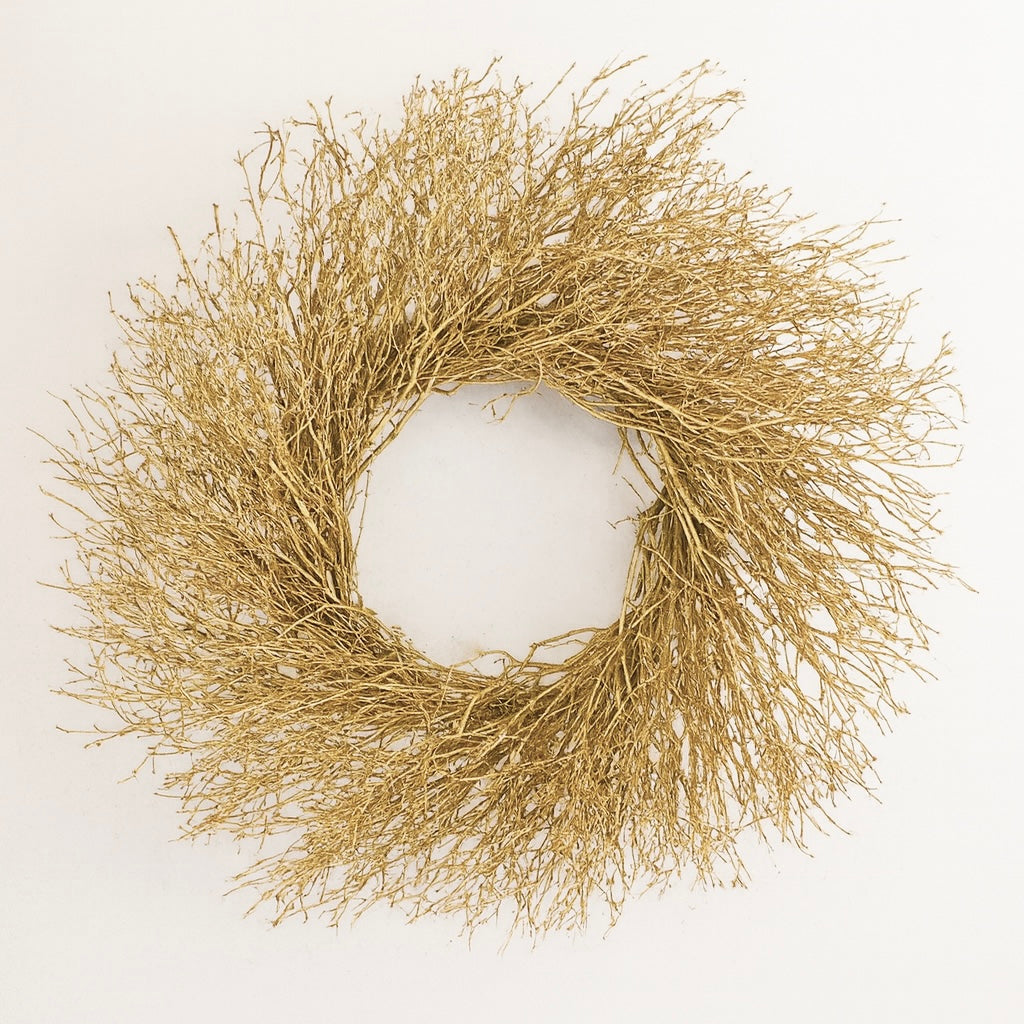 This wreath is crafted from natural dried quail brush twigs that are painted metallic gold, creating an airy, organic form with delicate texture. Its wispy branches bring a touch of rustic elegance, making it a versatile piece that complements both modern and traditional décor. Minimal yet striking, it’s perfect for year-round display or as a subtle seasonal accent.