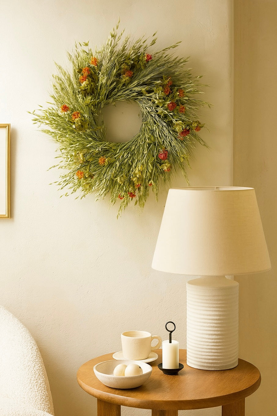 A graceful celebration of natural textures, this wreath is handcrafted from air-dried avena oats, lush green wheat, and bright safflower blooms. The soft sweep of grasses creates a layered, feathery base, while the safflower adds lively pops of warm orange, echoing late-summer fields and golden harvest light. Timeless and versatile, it brings a fresh yet enduring touch to any space—perfect for hanging in entryways, kitchens, or living rooms as a statement of natural beauty preserved.