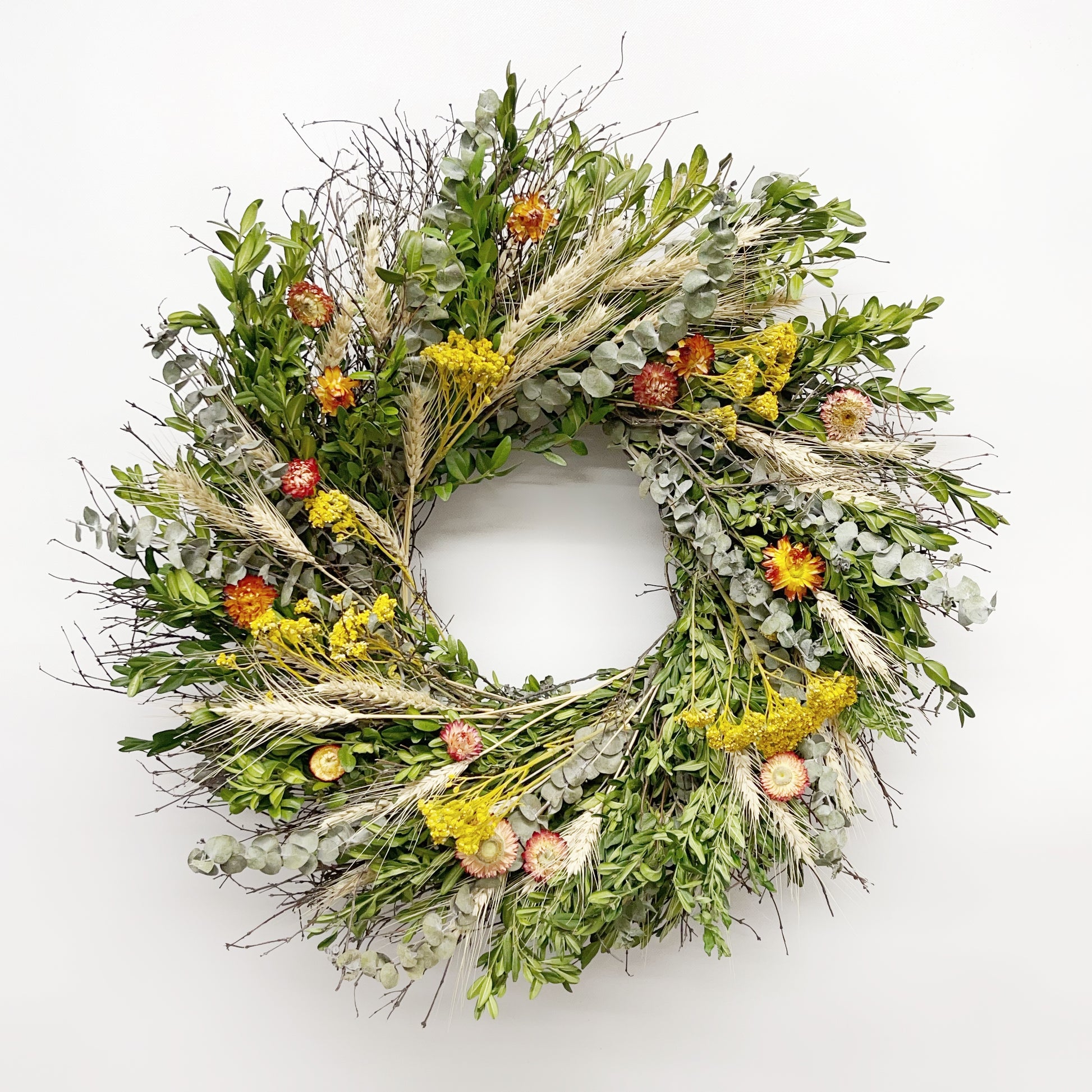 This autumn wreath is handcrafted from air-dried twigs and lush boxwood, layered with golden yarrow, soft baby eucalyptus, and sun-kissed blonde wheat. Strawflowers in warm fall hues are tucked throughout, adding a natural brightness and texture. The blend of airy greens, golden grains, and seasonal blooms creates a timeless statement piece—perfect for welcoming the harvest season indoors.