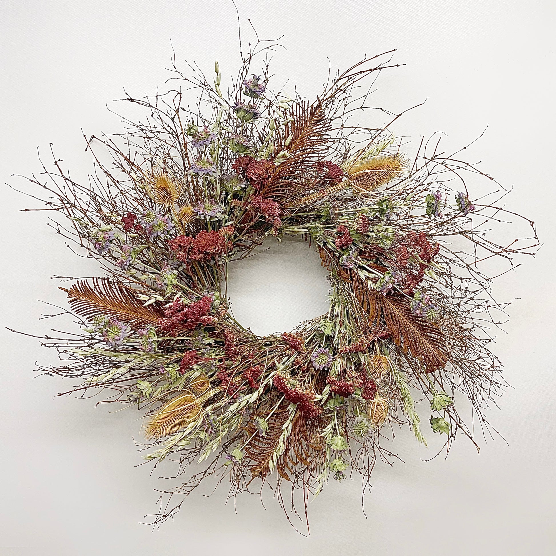 Golden teasel heads and dried brown fern fronds lend the piece its untamed soul — sculptural, earthy, and timeless. Every stem has been air-dried on our farm, preserving its shape and character for seasons to come.
