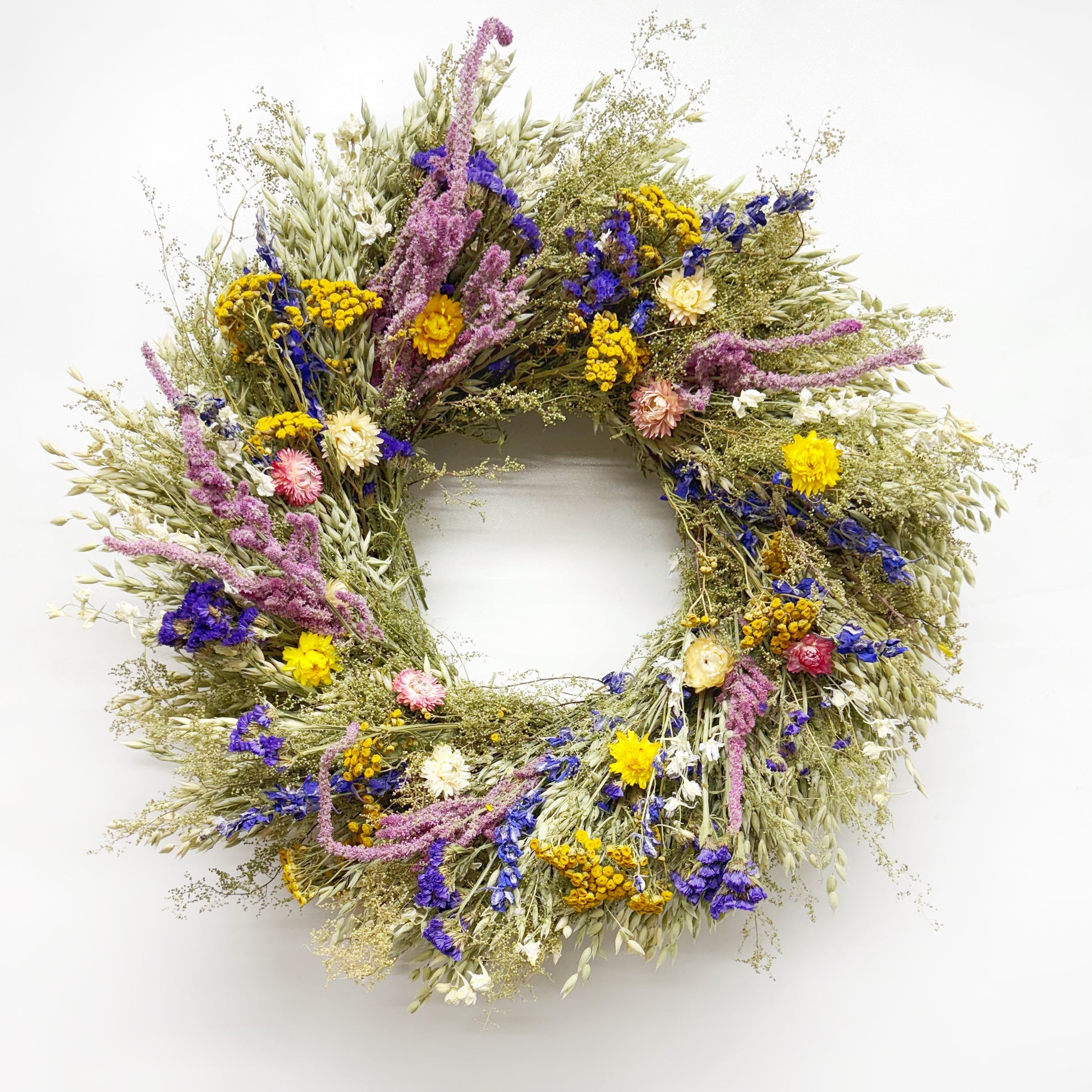 A colorful dried wreath handcrafted from avena oats, sweet annie, blue and white larkspur, rattail and sinuata statice in pinks and purples, accented with delicate pastel strawflowers—bringing a touch of wildflower charm to any space.