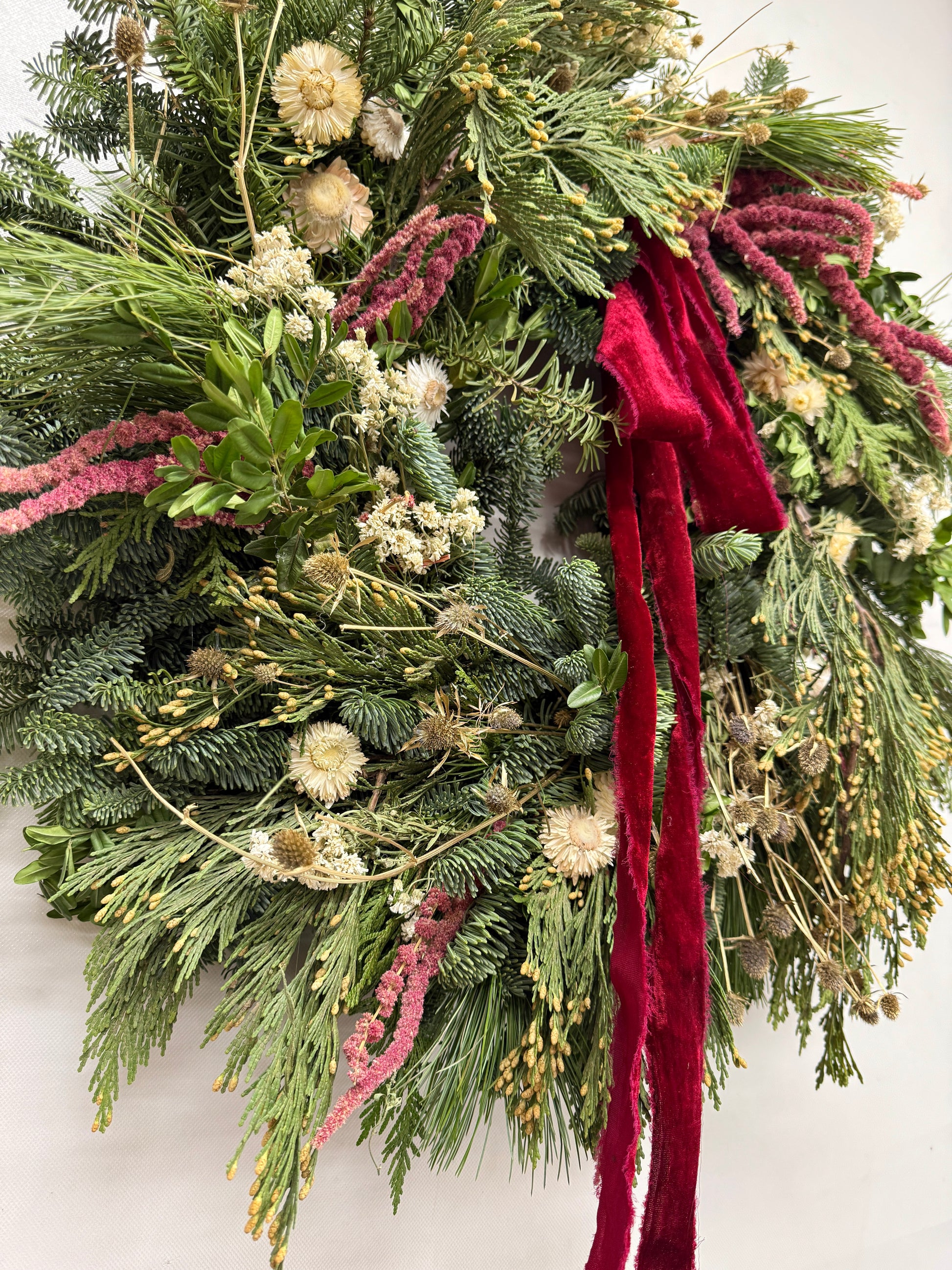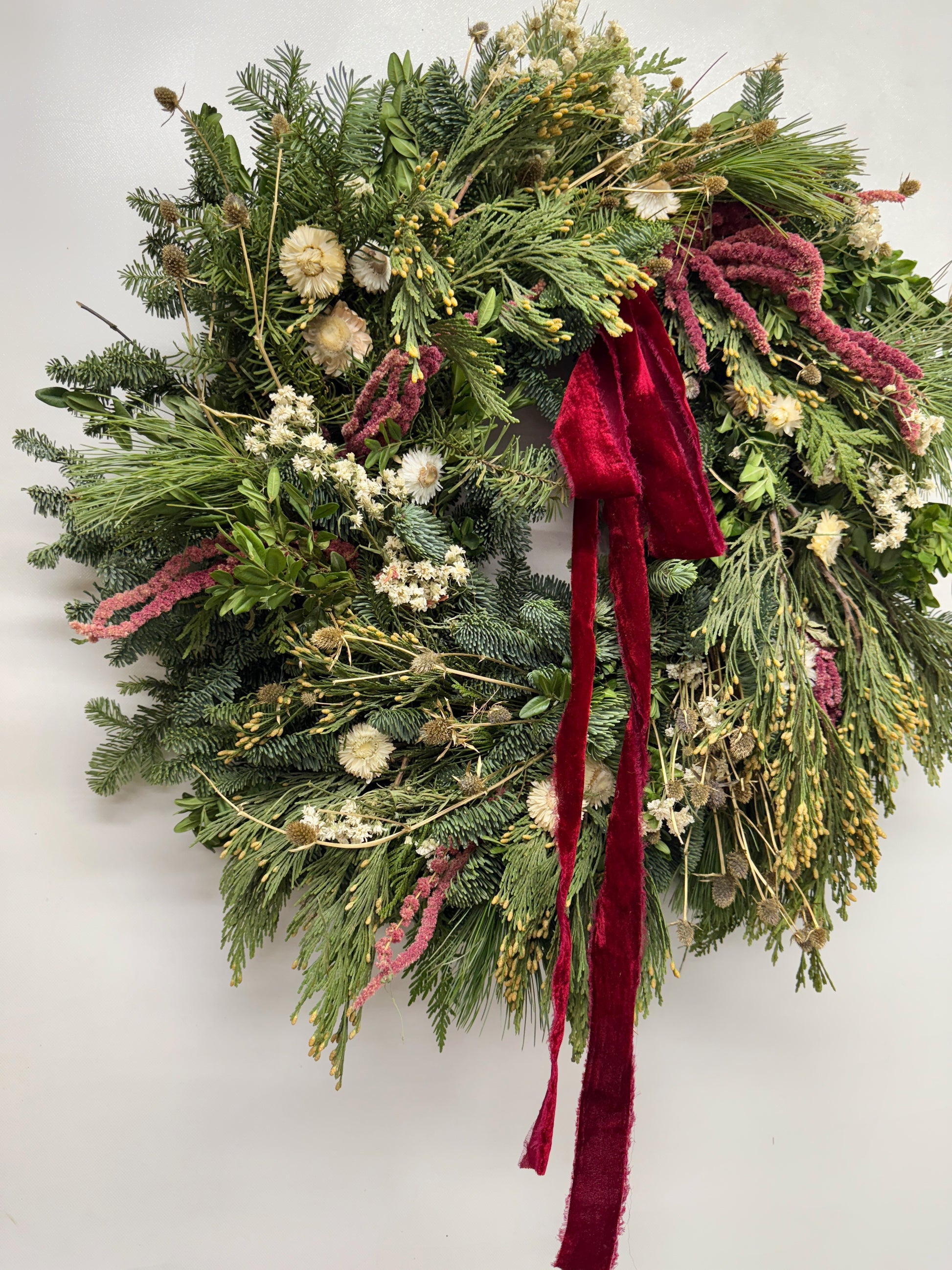 Step into a quiet woodland hollow with this richly layered winter wreath, where deep burgundy tones meet soft, forest-green evergreens. Amaranth Hollows is hand-crafted on our farm with a lush blend of fresh noble fir, white pine, incense cedar, and boxwood—creating a full, fragrant base.