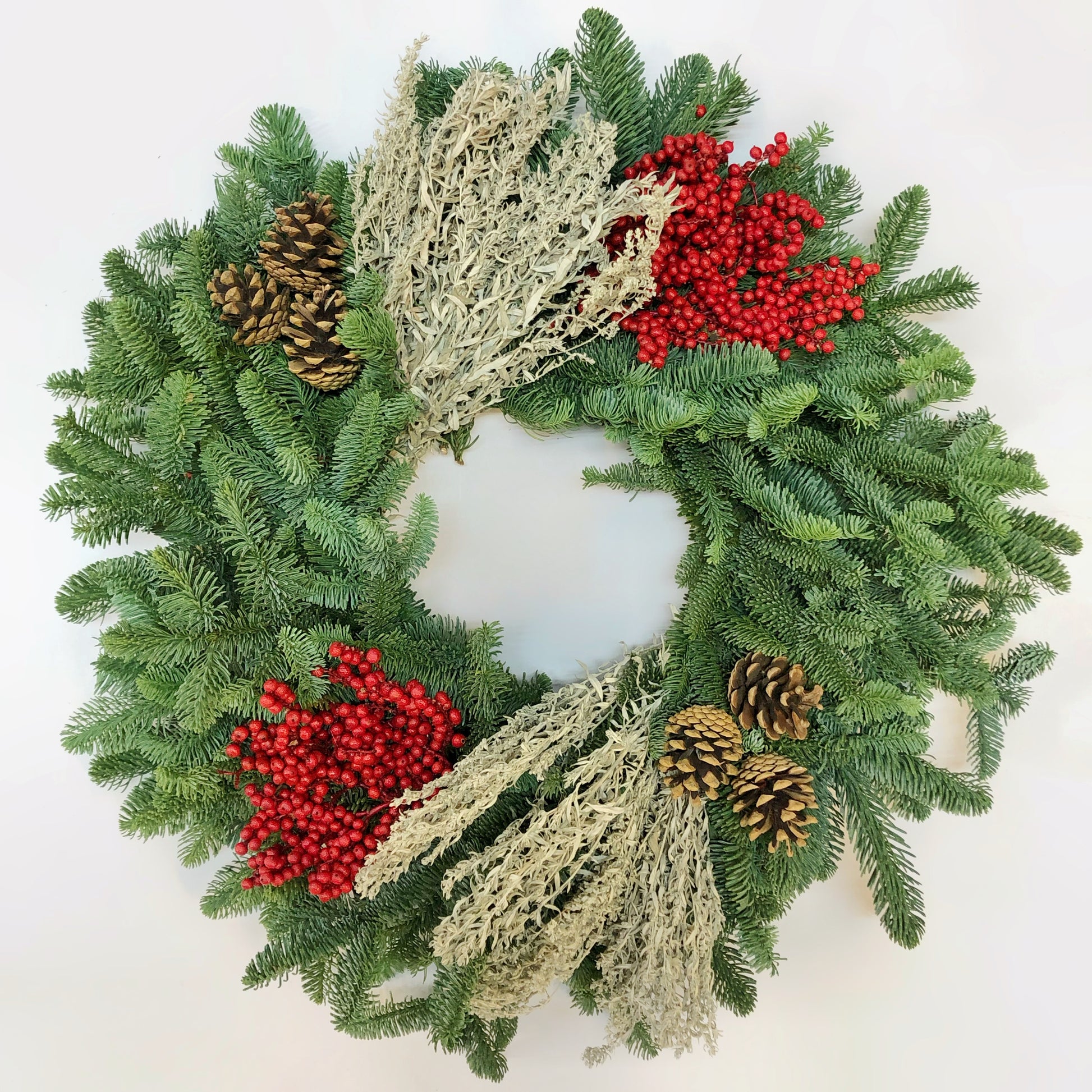 A timeless celebration of winter’s quiet abundance, the Heritage Gathering Wreath is handcrafted from freshly cut Pacific Northwest noble fir, layered with naturally air-dried artemisia for a soft, silvery contrast. Clusters of vibrant red canella berries add a rich pop of seasonal color, while hand-foraged pine cones lend an earthy, heirloom texture — as if collected from a winter woodland walk.