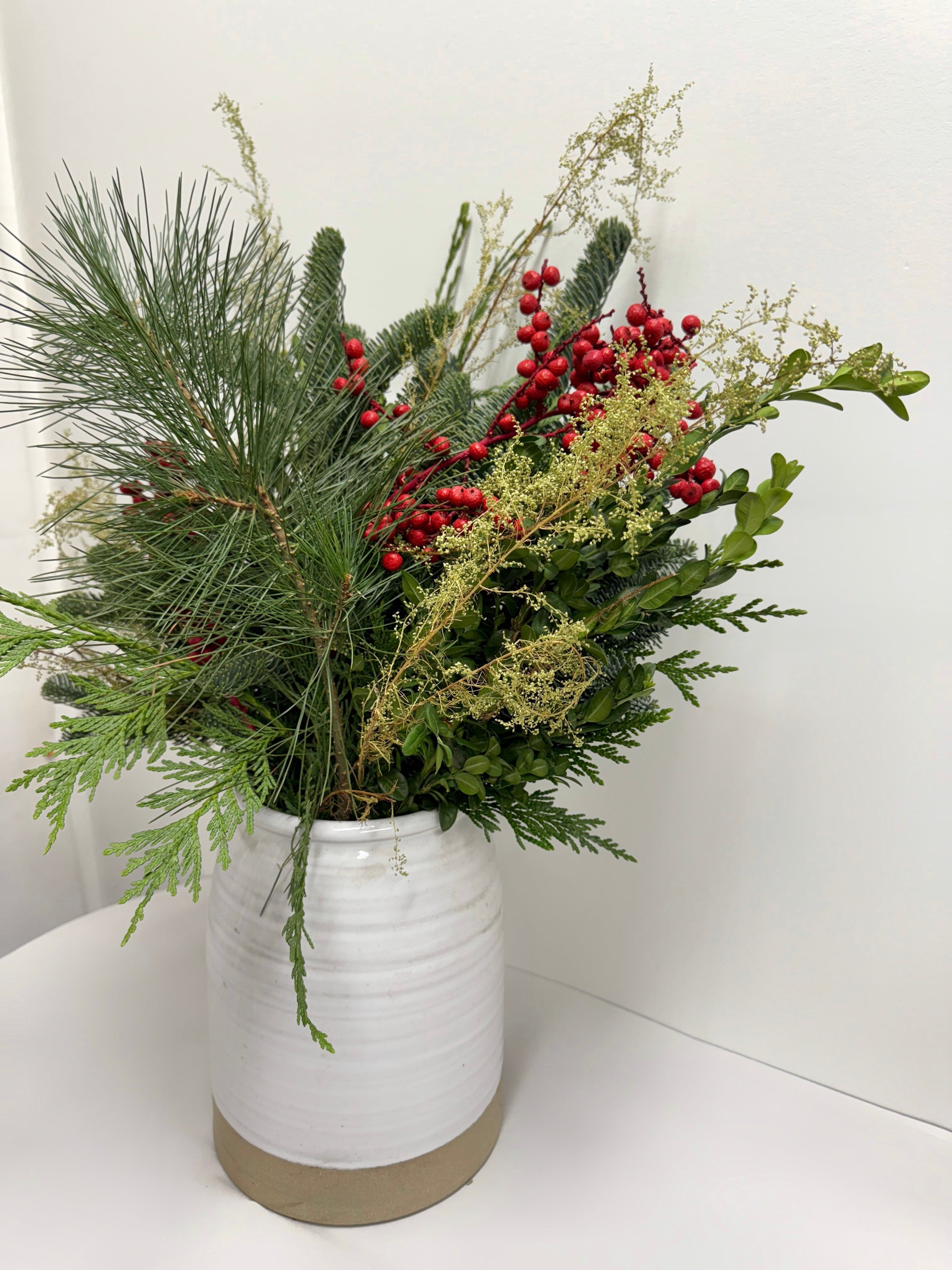 Air-dried sweet annie adds a soft, feathery elegance alongside clusters of deep red canella berries—offering the perfect pop of festive color. Fresh noble fir, white pine, boxwood, and cedar bring richness, fragrance, and structure, echoing the evergreens found in snowy northern forests.