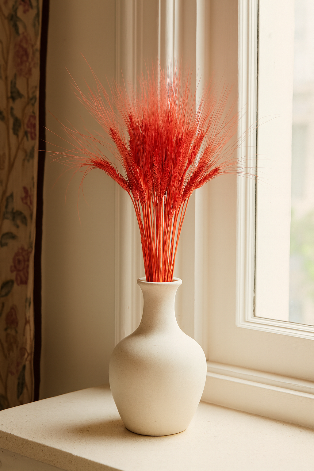 8 ounces of dried blond wheat that is hand-painted in bright red, and then arranged into bundles that will last throughout the years.