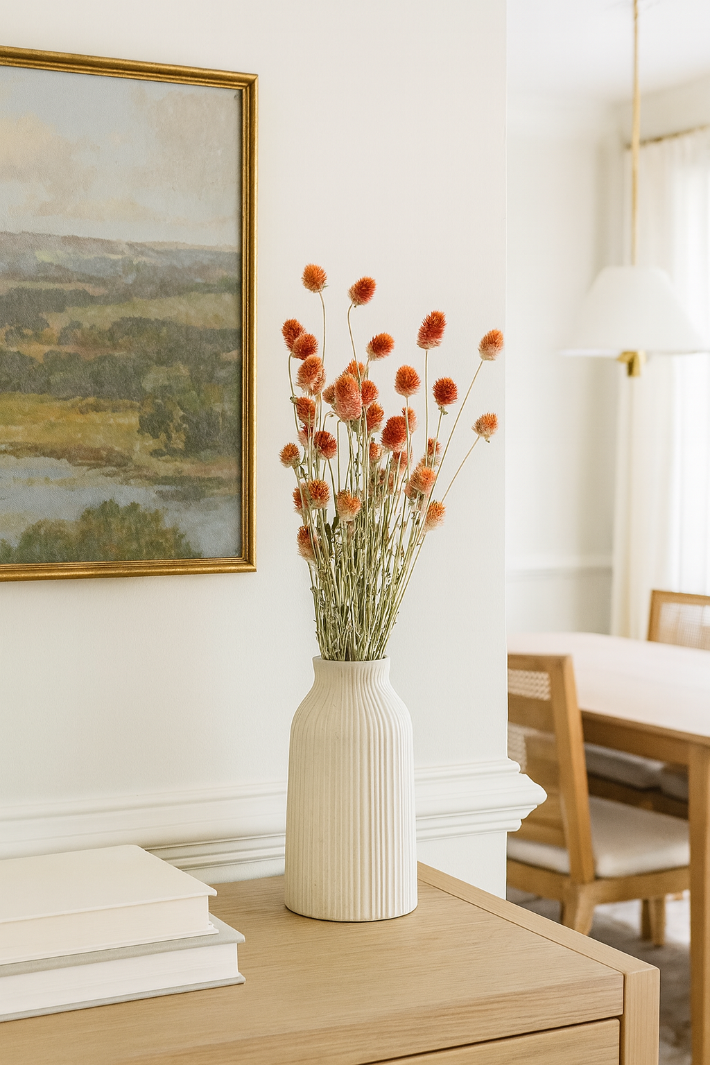 Dried Flowers: Our dried flower arrangements are made from natural botanicals and are ideal for indoor display. They can be hung outdoors under a fully covered patio, but please note that even under cover, exposure to sun, wind, or humidity may cause fading or deterioration. For best longevity, avoid direct sunlight, moisture, and fluctuations in temperature. When cared for properly and used indoors, dried flowers can last for years.